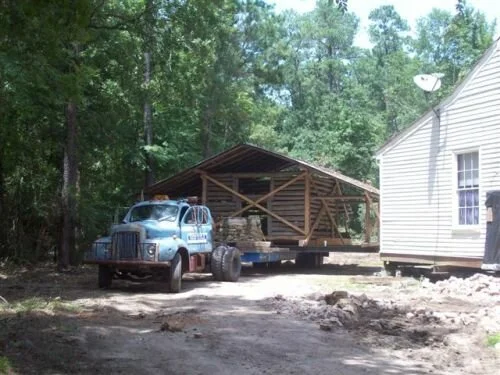 It took about 5 hours to move them the short distance from their original home to the City of Montgomery. Starting at 9PM on Thursday night, the moving team, consisting of the house movers, electric company, police department and assorted volunteers, began the slow trip through Montgomery country. Luckily, despite a few minor hiccups, the move went very well and the cabins are in-place and ready to be lowered onto their new foundations.